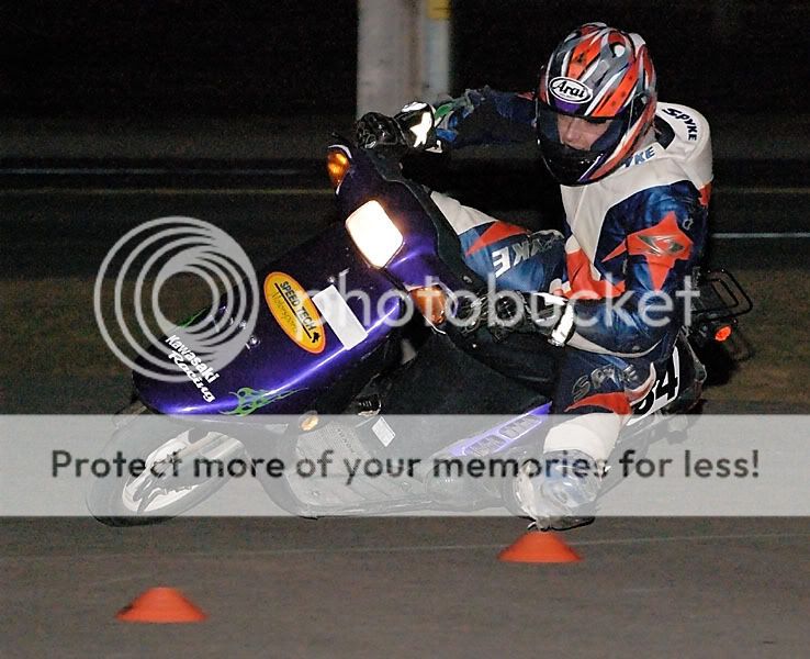 Alright guys bring it on. We have several classes to run. I ride em all, but my personal favorite is the unlimited class. Run whatever you think is going to get you around the course the quickest. We also run pocket bikes & CRF 50's on this track. So far I hold the record with the spree at 12.50. Jimmys best was running the CRF50 on motard tires. He managed a 12.71 I think. My best on the CRF50 was a 12.74.