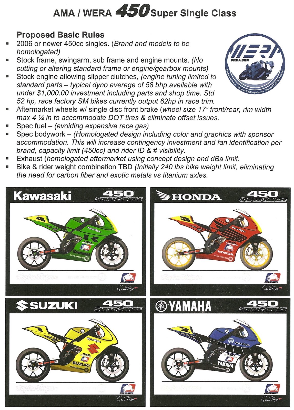 I feel like I should comment.... I saw the 450 mxer/roadrace bikes being ridden by Schwantz/Elana Meyers and Rolland Sands out at Laguna.... The bikes are hard to tell apart from a 250 at a distance - but man are they LOUD and SLOW.... Not to mention that it took about 30 minutes to get one of the bikes to start.....They are going to have a specific class in WERA for them next season - but that doesn't mean that the AMA is going to addopt them as the new entry level AMA class... I would venture to say that they shouldn't go that route - and after riding a two stroke for the first time this past weekend at Mid Ohio - they should go the 125 route - But then again I really feel that they should just bring back the 250's.... I think it would be less of a jump going from the 250 to a 600 then from a 125 to a 600... Oh and by the way - the 250's are a complete blast to ride.... I can't remember the last time I had that much fun on a bike.... I wouldn't mind riding a 250 more often - and yes, the 2 strokes are smaller and more cramped(I'm 5'11'' and 165lb) - but it just takes a few minutes to get used to ur elbows being past ur knees when your in a tuck.... The nice thing is that it is a real race bike - made specifically for racing - and that they turn without any real effort... Brian is right - it makes you a better rider because you have to learn to carry corner speed and keep your mistakes to a minimum... But I also like Dave's idea about an SV class - talk about cheap and simple... Plus after you get done learning how to race you Street Bike/Race Bike SV - you go to your Street Bike/Race Bike 600 - not go from your Race Bike 125/250 to Street Bike/Race Bike 600.... I can see both sides of the coin tho.....